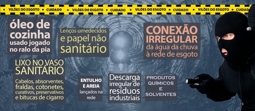 Resíduos e materiais sólidos descartados de forma indevida no sistema causam entupimentos, retorno de esgoto aos imóveis, extravasamentos e danos ambientais