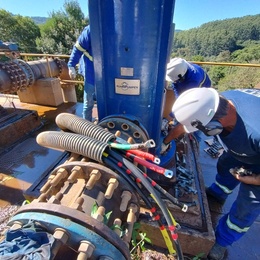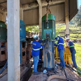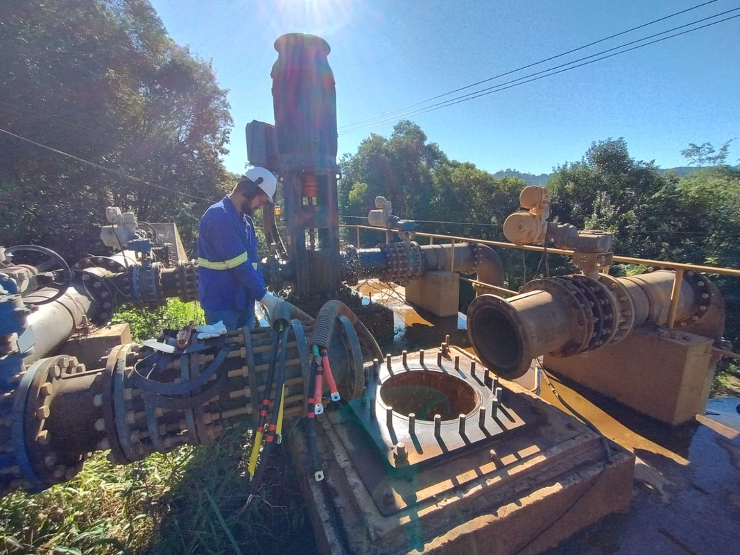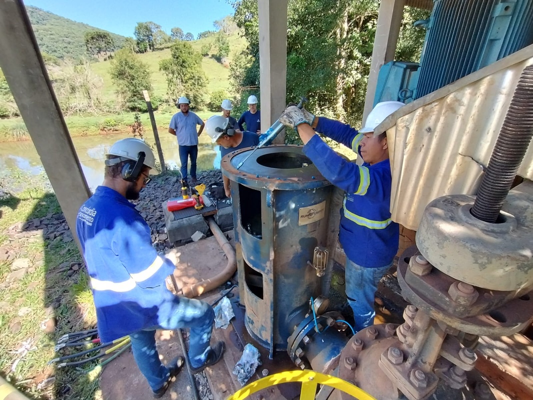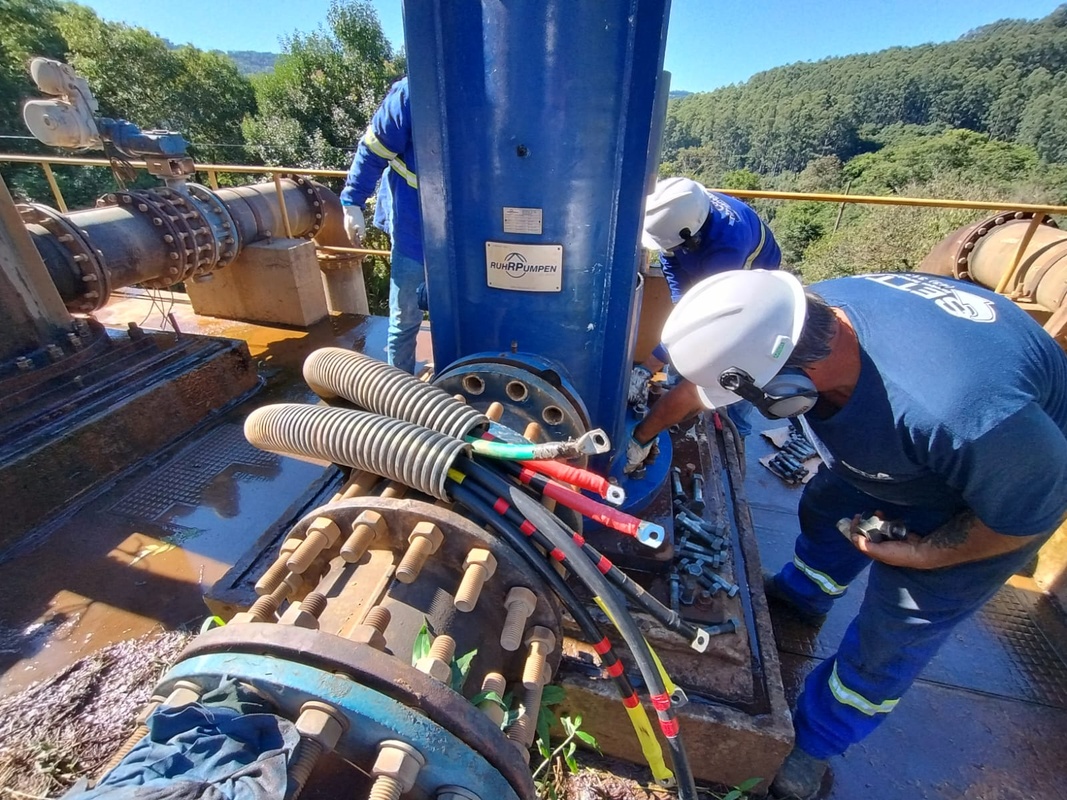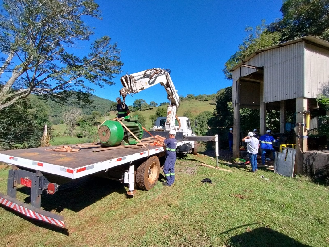 Na sequência, a equipe se deslocou recolocou o motor de 400cv na captação do Rio Jacutinga. O equipamento apresentava ruído alto e foi removido para receber manutenção, com troca de rolamentos. Havia o risco de ocorrer travamento dos rolamentos, podendo queimar o motor ou danificar o eixo da bomba.