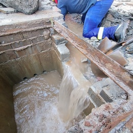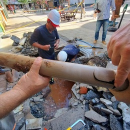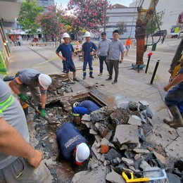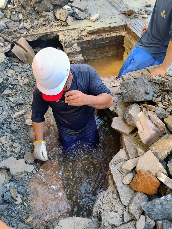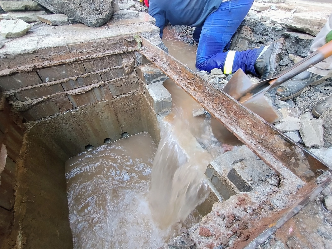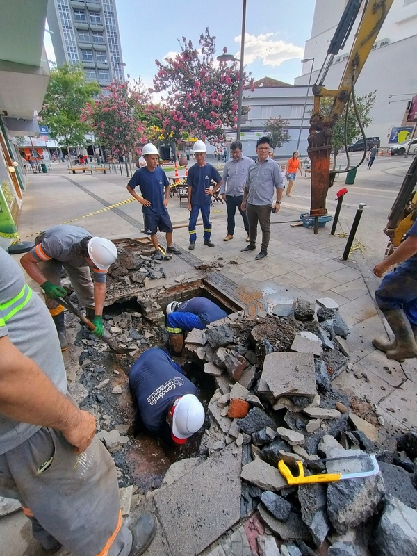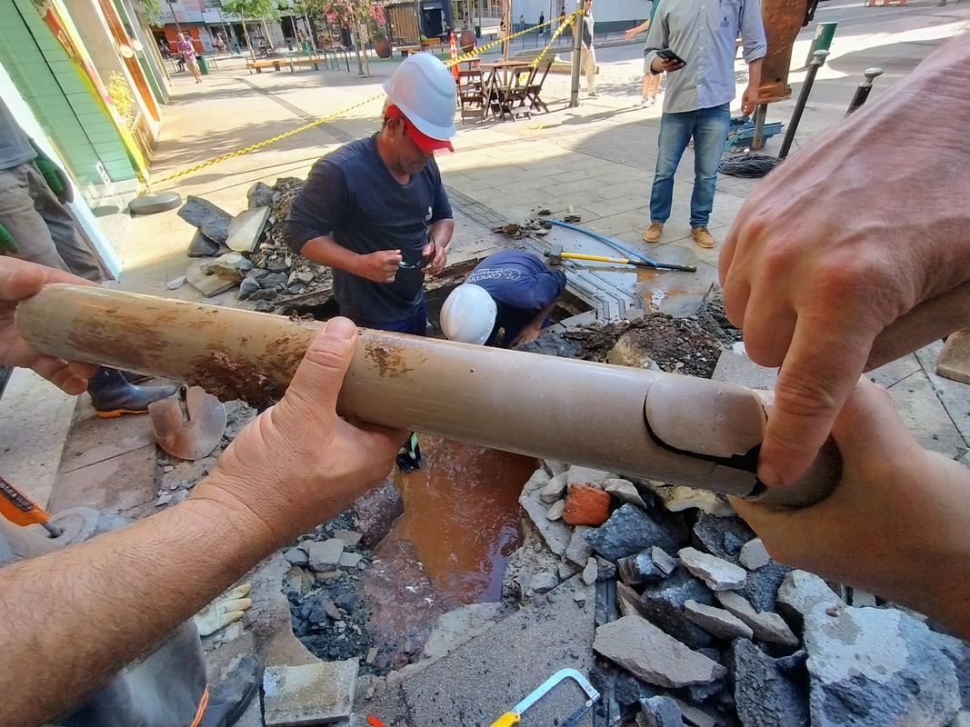 Nesta segunda-feira, a queda brusca nos níveis dos reservatórios da região central contrastou com o aumento da vazão da ETA. “Imediatamente, colocamos nossas equipes de geofonia na rua e identificamos o problema na Travessa Brunetto, quase esquina com a Rua Anita Garibaldi”, explica Epstein. A água escorria para dentro de uma caixa de telefonia e acabava sendo drenada para o Rio dos Queimados. A Concórdia Saneamento rapidamente mobilizou profissionais e equipamentos para fazer a intervenção, dificultada pela existência de uma laje de concreto soba a calçada e a presença de fiação de telefonia.