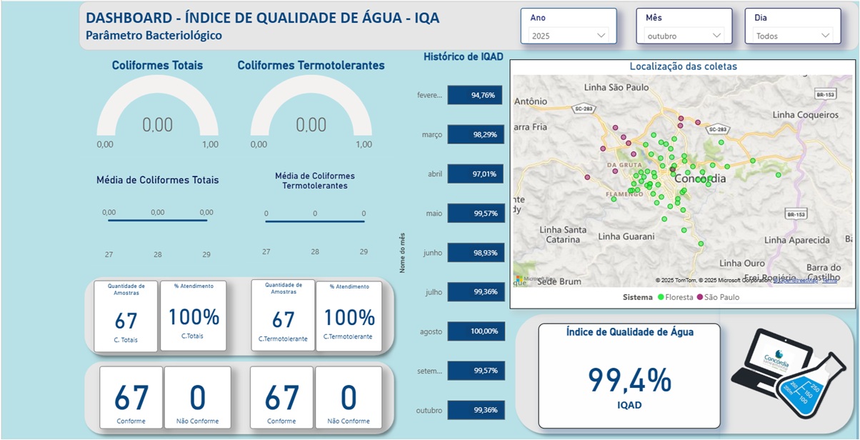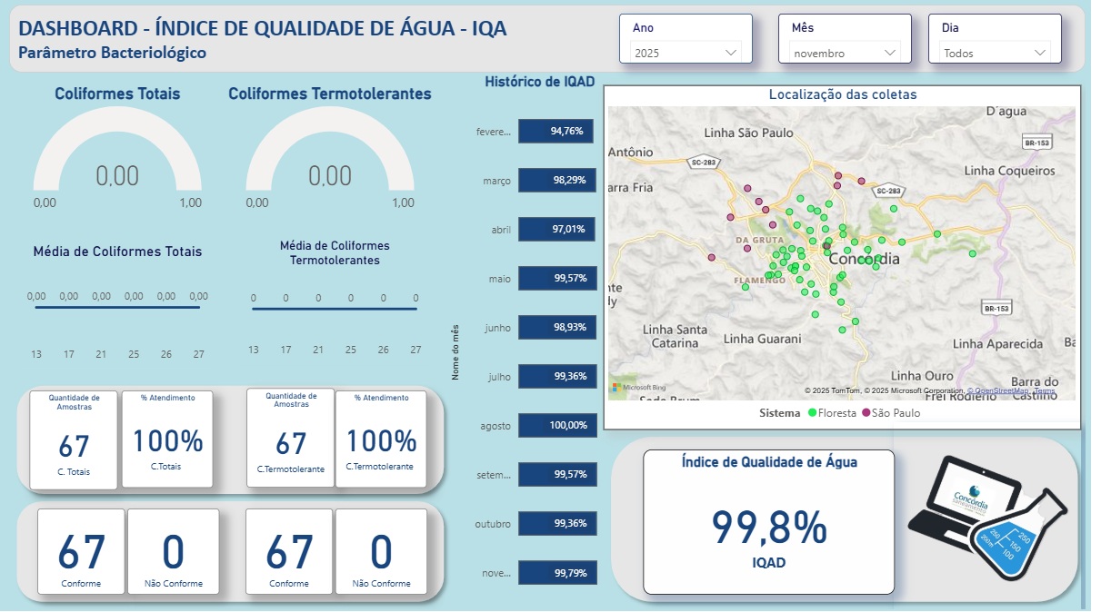 Os serviços de abastecimento de água e esgoto de Concórdia passam por um rigoroso sistema de qualidade. Todos os processos são monitorados para que a água seja tratada com eficiência, desde as fontes de captação até o cavalete do seu imóvel. Os testes são feitos com análises bacteriológicas e físico-químicas e seguem o padrão estabelecido pela Organização Mundial de Saúde (OMS)